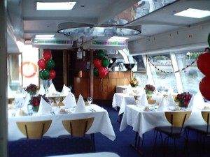 Before the first act, evening-gowned and black-tied guests enjoyed a five course dinner in the First Class dining-room upstairs. Downstairs, “steerage“ passengers in appropriately less formal dress, were surrounded by the glass-fronted engine room “fires” and overhead pipes. The actors used the stairs as part of the set, incorporating the dramatic action in both sections very cleverly. |