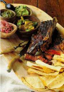 To serve, cut the steaks against the grain into strips 3 to 4 inches long and about 1/2 inch thick. Put the bones on a separate platter. Set out the fire-roasted chiles, tortilla/cheese setups, guacamole, and salsas, and encourage your guests to go for it. Pass around the steak bones for true carnivores to gnaw on and toss over their shoulders to the dogs. Beer (preferably Mexican) goes great here, but a spicy Zinfandel would also be delicious.