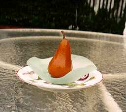 Serve pears warm or at room temperature. To serve, spoon some of the syrup into a bowl, stemmed dish or glass, then set a pear on top. Spoon 1 tablespoon heavy cream over each pear. Serve with tuiles cookies (recipe follows).