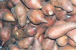 It is possible to make an enormous fuss over the difference between sweet potatoes and yams. Botanically speaking, the two vegetables share nothing except for some flowery associations. The yam, a tuber, is a member of the lily family, while the sweet potato is a member of the morning glory family. Yams are usually sweeter, moister, plumper, denser, and a deeper orange color than sweet potatoes -- though not always. The two plants also come from different parts of the world. The yam probably originated in Africa (although it may be the same plant that had been cultivated in Asia since 8000 B.C.); the sweet potato is a New World plant discovered by Columbus (although it may have mysteriously traveled to Polynesia hundreds of years prior to Columbus's first voyage). Slaves in the American South called the sweet potato nyamis because of its similarity to a vegetable of that name that they knew from their homeland. This African word brought the two vegetables together, probably for all eternity, despite botany, archaeology, plant pathology, and the like. And that's probably just as well.