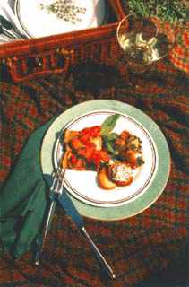 First we will start our meal with a wild mushroom and toasted walnut spread for crostini, followed by pre-grilled eggplant slices stuffed with smoked mozzarella, sauteed spinach, golden raisins, and imported black olives, served with a fresh tomato-mint sauce. The advance grilling of the eggplant and the smoked cheese join together to create a delicious, earthy, early fall entree. Complementing this dish is a bowl of small red skinned potato and roasted bell pepper salad tossed, while still warm, with a mustard-caper vinaigrette. We'll finish our meal with a plate of fresh mission figs and lightly sweetened mascarpone cheese.