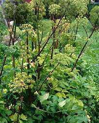 Angelica makes an attractive backdrop for other herbs, not only because of its height. Angelica's bright green leaves, made up of three finely toothed leaflets, and its stems also are a pleasing contrast in the garden. Angelica's long sturdy hollow stems are ribbed. Delicately colored, they start out purple at the base and lighten to a pale yellow green. Angelica is a biennial, and usually only blooms every two or three years. When the blossoms do appear, in mid to late summer, they tower above everything in the garden: globes of tiny yellow or white flowers. As they mature, the flowers produce small oval seeds. It is best to plant the seeds right away, but they can also be refrigerated in an airtight jar for planting later, either directly in the ground, or starting them in seed trays. Angelica prefers a warm, not hot, climate. It also does well in a area with filtered shade and rich soil. Start seeds in clumps but thin early to avoid overcrowding of these giant members of the parsley family.