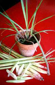 When buying lemon grass fresh, be sure to check the bases to see if there are any vestiges of roots. If so, you have a bonus -- you can take this stalk and start your own lemon grass plant. Place the root end in water with a bit of plant food and wait until the roots develop. Plant in an area that gets full sun but is protected from the wind. Being a native of the tropics, lemon grass prefers a sandy soil and plenty of moisture. It is a member of the grass family (Gramineae) and is considered a tender perennial. Outside of the tropics it is treated as an annual, since it is sensitive to frost. It grows well in pots (they prefer a lot of room). This way, you can transfer the pots to a green house over the winter in colder areas. Like most grasses, lemon grass is a quick grower, getting up to 6' tall under ideal conditions: outside the tropics it will grow to about 3'. It will even grow indoors with sufficient light and heat.