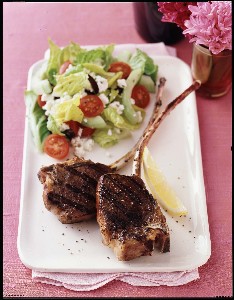 With the lamb chops, toss together all the good things you’d find in a Greek salad: shredded romaine, cucumber, tomatoes, onion. If you like, Italianize it by replacing the usual feta with ricotta salata, another sheep’s milk cheese, and using gaeta olives instead of kalamatas. Dress the salad with a lemon vinaigrette and, as the finishing touch, head back to the herb patch for a few baby mint leaves to scatter on top.