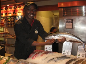 Now for the big time: the Union Square Greenmarket in New York City. This time I showed how to serve the poached mackerel on a hearty salad of greens, potatoes, celery, bell peppers and capers (see recipe). Over 3 hours, about 250 people stopped by to taste. I can’t swear everybody loved it but there sure were a lot of mackerel swooners—to the point that, after our plate and fork supply gave out, folks were eating the salad off their napkins.