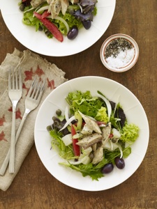 4. Line 4 salad plates with torn greens and spoon the salad on top; top with the mackerel and garnish with olives.