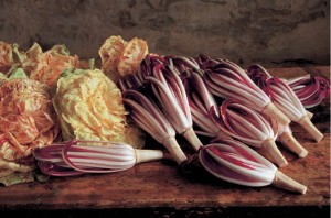 A perfect solo meal for a chilly night, this risotto features nutrient-rich radicchio, a member of the chicory family that Veneto growers are marketing as “the winter flower.” Radicchio rosso di Chioggia, familiar to us as the wine-red globes that are also found shredded in prepared salad green mixes, have been joined by several other varieties that differ more dramatically in appearance than in flavor. Early Treviso radicchio comes in compact elongated heads, while the splayed leaves of late Treviso resemble the plumage of an exotic bird. Variegato di Castelfranco, another variety, has tender cream-colored leaves speckled with red.