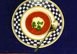 From a Spanish Parador feast comes the inspiration for this flavor-packed spring menu, ideal for entertaining. Endive tipped with curried scallops makes a delightful appetizer. A spicy tomato soup leads off the dinner menu. An aromatic sausage and vegetable-stuffed lamb follows with pine nut and currant-strewn pilaf and fresh seasonal artichokes or new peas. The citrus zest of orange and peppery bite of arugula compose a refreshing salad course. Dessert features the Spanish favorite-caramel-glazed custard with berries. Preparations can be done well in advance for the soup, dessert, and stuffing the lamb. The other elements are fast to assemble.