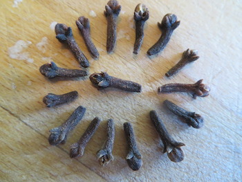 Cloves are the flower buds of a spice tree that grows in India, Pakistan, Sri Lanka, and Zanzibar, among other places. The buds are pink, but as they dry turn a deep brown color, which is what is sold in markets. They have a warm, but strong flavor and can be found in everything from Middle-Eastern curries to European baked goods like ginger bread.