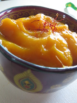 2. Place mango chunks in blender with applesauce, saffron mixture and water or milk. Blend until a smooth purée is formed. Serve cool or at room temperature.