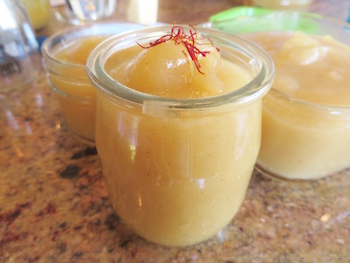 By far Kirina and Ela's favorite recipe is my Saffron Applesauce. It's an unlikely, but exotic way to season apples. Saffron threads are actually the dried yellow stigmas of a special crocus flower. They are harvested by hand and are considered a prized and valuable spice. Saffron imparts a mild, sweet flavor to dishes, and a golden yellow/orange color to dishes like paella, and many Middle Eastern and Indian rice and dessert dishes. Combined with applesauce you have an exotic treat. Try this recipe the next time you want to tempt tiny taste buds: