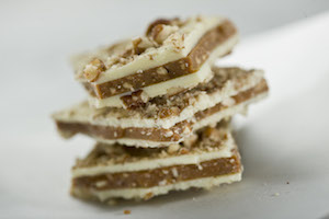 Texas Toffee Queen (www.texastoffeequeen.com) has a Dark Chocolate Salted Blood Orange and a White Chocolate Mango Chili. If you have ever pondered the concept of alcohol in toffee (and I'll be honest; the idea had never occurred to me), Goodytwos Toffee Company (www.goodytwos.com) has beaten you to the proverbial punch, with their Creme de la Crunch (coffee liqueur) and tequila-infused Nutty Twist. Oregon's Holm Made Toffee Co. (www.holmmadetoffee.com) produces a hazelnut toffee with lavender and another with red pepper flakes.