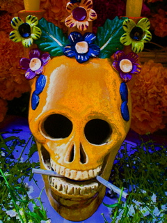 The Aztecs used papel picado or paper banners in their religious rituals and this tradition is still carried out today. Curtains of papel de china picado are hung behind the altar in designs cut-out with skeletons, flowers, birds, and coffins. Purple banners represents mourning and hot pink or bright orange banners signify the joyful return of the departed to the land of the living. In many part of Mexico, families spread a floral carpet on the ground leading to their home so that the spirit does not get lost along the way. A central idea behind the creation of the Ofrenda is to share with the dead the pleasures of life. Pulque, beer or tequila are served as reminders of the good times on earth. A former smoker will be treated with his/her favorite brand of cigarettes and Coca Cola is inevitable. The Ofrenda is an offering or helping force, and a visual expression, without judgment, of the gratitude, love and veneration the family feels for the visiting spirit of their relative.