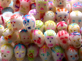 The journey from Mictlan , the Aztec name of the Underworld, is long, tiring and treacherous. A wash basin, towel, soap and a mirror are placed near the Ofrenda so the departed spirit can cleanse themselves before joining in the festivities. A glass of water is always set out for the soul to quench its thirst. Other beverages served at the feast are fruit-flavored water ( agua fresca ) and the popular hot corn drink flavored with chocolate sold on the streets of Mexico, atole . Decorated sugar skulls are an essential part of the altar and, in the weeks preceding the holiday, women are working round the clock to prepare the sugar creations found in the famous sugar skull markets of Patzcuaro and San Miguel de Allende. The names of the departed are written on the sugar skulls, but also the names of the living, to remind us all of life's fragility. Small sugar skeleton figures of the person’s trade or whimsical cartoon characters for the dead child are sold in the mercados . Sweets are particularly essential for the muertitos or little dead ones, along with newly purchased toys. The abundance of coconut candy, sugar cane, and pumpkin cooked in brown sugar syrup ( calabaza en tacha ) ensure that muertitos will need to visit a dentist upon their return to the other side!