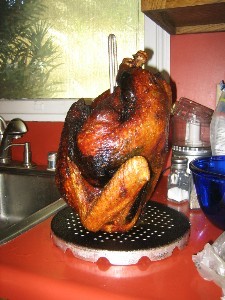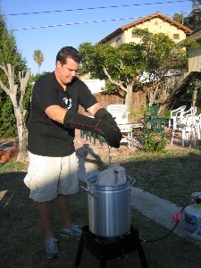 10) Remove the bird when the time is up. Let all oil drip off before taking inside (oil will stain your concrete and wood, so we recommend frying on the grass if you can). Let the bird sit for 20 minutes, remove from the spit, and carve.