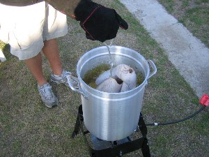 2) The next step is to determine how much oil you will need. You can best do this by first placing the bird (with the plastic cover still on) inside the pot and filling it with water until the water just covers the bird. Either make a note of how many gallons of water you used or remove the turkey and mark the water level. The amount of oil varies with the size of the bird, but we found that our 13 lb turkey needed about 4 gallons of peanut oil. After marking the proper level, empty the water out of the pot and dry the pot thoroughly. This is a safety feature and is quite necessary. Then fill the pot with peanut oil to the previously marked level.