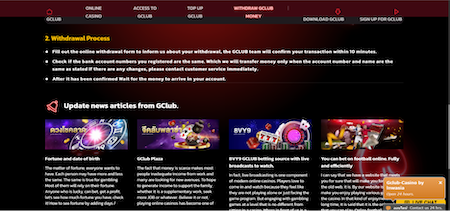 Withdrawal Process: 1. Go to Gclub's website. 2. Scroll down to the bottom of the home page. You'll find four headings there: Game Types, Game Providers, Register, Other. 3. Click on "Withdraw money Gclub" present under the heading "Register." 4. It'll direct you to a form. 5. About the way and what to do next: