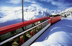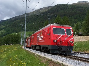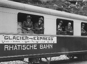 When the Glacier Express made its maiden voyage in June 1930, it was a major cooperative effort between three rail companies, the Brig Visp Zermatt Railway (BVZ), Furka Oberalp Railway (FO) and Rhatische Bahn (RhB). The service was suspended from 1943 to 1946 because of the war. Originally, each company had its own cars and colors; beginning in 1968, the train was painted red to give it unified look. The train was only able to operate seasonally because the heavy snow and the risk of avalanche prevented traveling along the Furka Bergstrecke in winter. Each fall, the overhead contact wires between Oberwald and Realp had to be taken down, the masts removed, the Steffenbach bridge dismantled and the section left to the mercies of the harsh winter. Each spring, the route had to be restored. With the opening of the Furka Tunnel in 1982, year-round service between the Valais and Graubunden became reality. In 1986, the first panorama carriages were installed. In 2003, the BVZ and FO merged to form the Matterhorn Gotthard Bahn (MGB). Now the Glacier Express is operated by two railway companies, the MGB www.mgbahn.ch and RhB www.rhb.ch .