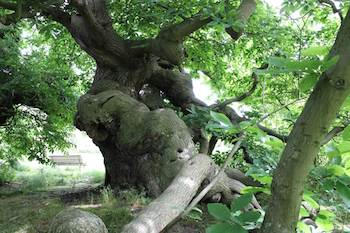 And then he points us in the direction of the formal gardens and two enormous sweet chestnut trees. Their contorted trunks and limbs spiral around us and sweep down to the ground. The deep furrows in the bark cry out to be touched and even caressed for they are centuries old. It was the Romans who introduced them to England and somewhere there will be one or two even older than the Magna Carta itself.