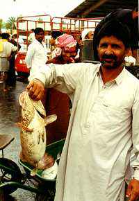 We were enthralled with our visit to the Fish Market. There were fish on stalls, and fish in buckets, fish steaks, fish slices and unrecognizable fishy bits. Fish was being sold off the back of pick-ups, and there were plenty of buyers. And no wonder! The 129 varieties of edible fish that are found in the waters of Dubai looked marvelous -- big, healthy and very clearly just-caught, with many still flapping away. Remember all that hype from the Gulf War when we were told that the marine life of the Gulf would be wiped out by the oil-spills? We have good news for the Cassandras who made those predictions. Judging by the large healthy-looking fish we saw, the announcement of the demise of their species was highly exaggerated.