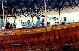 By this time we were more than ready for a late lunch at "Al Boom," an unusual restaurant housed in a large Arabian dhow permanently moored along the bank of The Creek. The main deck had been covered over so that it was delightfully shady, the buffet platters of seafood looked fresh and tempting and judging by the number of businessmen, both Arab and Western dining here, Al Boom was a booming success.