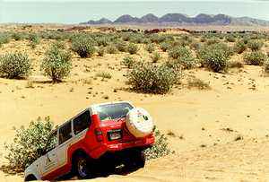 With engine revving, the Landcruiser picked up speed and approached the insurmountable-looking sand-dune in front. The vehicle tilted as it began climbing the almost-vertical dune which curved up at an intimidating angle and vanished on a razor's edge. On the verge of stalling, we hit the top, pushed through the sand-ridge at the edge, and suddenly tipped forward quite violently as we raced downhill, picking up speed and headed for the next dune.