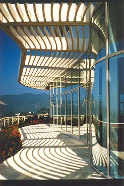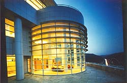 After all this looking and walking, a visitor works up a powerful hunger. Good thing the Getty has many places to grab a bite to eat. There are a number of Cafe Espresso carts located throughout the Center serving drinks and snacks. Pre-packaged, yet fresh and tasty, fare can be purchased at the Museum Cafe, a self-service cafeteria. Salads, sandwiches, and snacks can be yours here for $3 - $7. The Cafe shares an outdoor dining area with a Cafe Espresso and overlooks the Central Garden. Also cafeteria-style, but made to order, is the aptly named The Cafe. The Cafe (open 11 - 3 daily) is an indoor/outdoor restaurant serving pizzas, salads, grill items, sandwiches, and desserts. The Cafe is reasonably priced and our lunch for two rang it at a mere $18.50 -- a bargain when compared to the prices at most museums. For upscale dining, try The Restaurant where lunch, afternoon tea, and evening refreshments are served by a well-heeled waitstaff. Prices here range from $7 - $12/entree. Reservations are recommended at The Restaurant. There is also a picnic area next to the lower tram station. Groups of 15 or more are asked to call ahead for reservations.