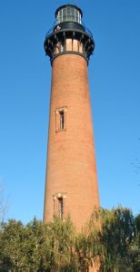 The lighthouses that dot North Carolina’s coast are legendary, and for good reason: the many shipwrecks that have occurred here over the years have led to the nickname “Graveyard of the Atlantic,” and these lights were often the only friend a sailor had. A dozen lighthouses still stand on the Outer Banks, among them the Currituck Beach Lighthouse in the hamlet of Corolla. Over a million bricks were used in building the 158-foot-tall structure, first illuminated in 1885. It still shines nightly, though we pay a visit during the day to climb its 214 smooth iron steps. From the top, we spy a bright blue sea as foil to whitewashed homes and businesses. The Bodie Island Lighthouse, Currituck’s (striped) twin, is due south and set to reopen in 2012.