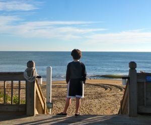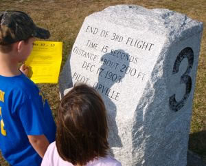 Orville and Wilbur Wright were part-time residents of the Outer Banks who sought this windswept landscape for their flying machines after hearing that the sand was soft (the better for landing), the slopes free of trees and shrubs (the better for gliding) and that wind velocity was, on average, 10-20 m.p.h. (the better for flying). We learn this and much more at the Wright Brothers National Memorial in Kill Devil Hills, a seaside outpost south of Duck. A Visitors Center in the main building is filled with informational displays on the Wright brothers’ journey and I’m startled by the fact that these two bicycle mechanics spent a mere thousand dollars on their years-long quest. The Wrights’ first powered flight took place on December 17, 1903 and large granite boulders mark the spot where four successful flights took place. Surprisingly, Steven decides to run the three-football-field length of flight #4 and I happily sprint along. After an informative ranger talk and show-and-tell with a full-sized replica of the 1903 flying machine, we climb nearby Big Kill Devil Hill and enjoy a panoramic view. I hold my boy close and hope his future holds the sense of adventure Orville and Wilbur possessed.